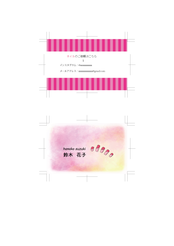 一つ前の作品の2パターン目。こちらはピンク系の色合いを水彩っぽくぼかした背景で1パターン目よりかわいらしい感じを出しました。こちらも漢字を丸文字にしています。裏面は濃いピンクと薄いピンクのストライプにして表面とは少し違ったテイストにしてみました。※名前、アドレス等の個人情報は変更して公開しております。