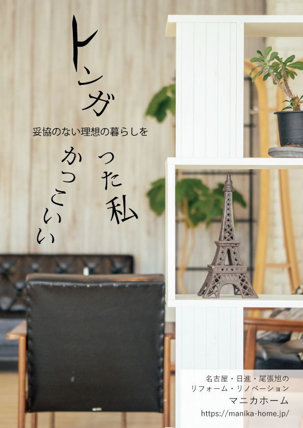 職業訓練校にて企業ブランディングの課題で愛知県のリフォーム会社であるマニカホーム様の企業ブランディングのチラシを作成しました。マニカホーム様のおしゃれなリフォーム、ワンランク上の暮らしを提案するという姿勢はお客様の理想を尖らせることであろうと思ったのでそれを「トンガった私かっこいい」というキャッチフレーズに落とし込みました。とんがったリフォーム会社というのは聞いたことがあまりないように思ったので、企業ブランディングとしては良いのではないかと思いました。ターゲット層は30~50代のハイエンド層。美容室やカフェ、ベーカリーなどおしゃれに敏感な人が訪れる場所へチラシを設置してアプローチすることを想定しています。