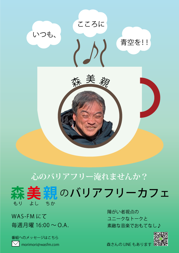 先のチラシの別バージョン。おしゃべり好きの森さんがラジオパーソナリティーを務めたら面白いのではないか、健常者の方が興味をもって聴いてくれるのではないかと思い、作ってみました。背景色は青から緑へのグラデーションで森さんカラーを2色入れました。また、喫茶店好きな森さんを表現するためにコーヒーカップのイラストを、音楽好きな森さんを表現するために湯気に音符を載せました。湯気が上がった先に「いつも、こころに青空を!!」という森さんの座右の銘を入れました。